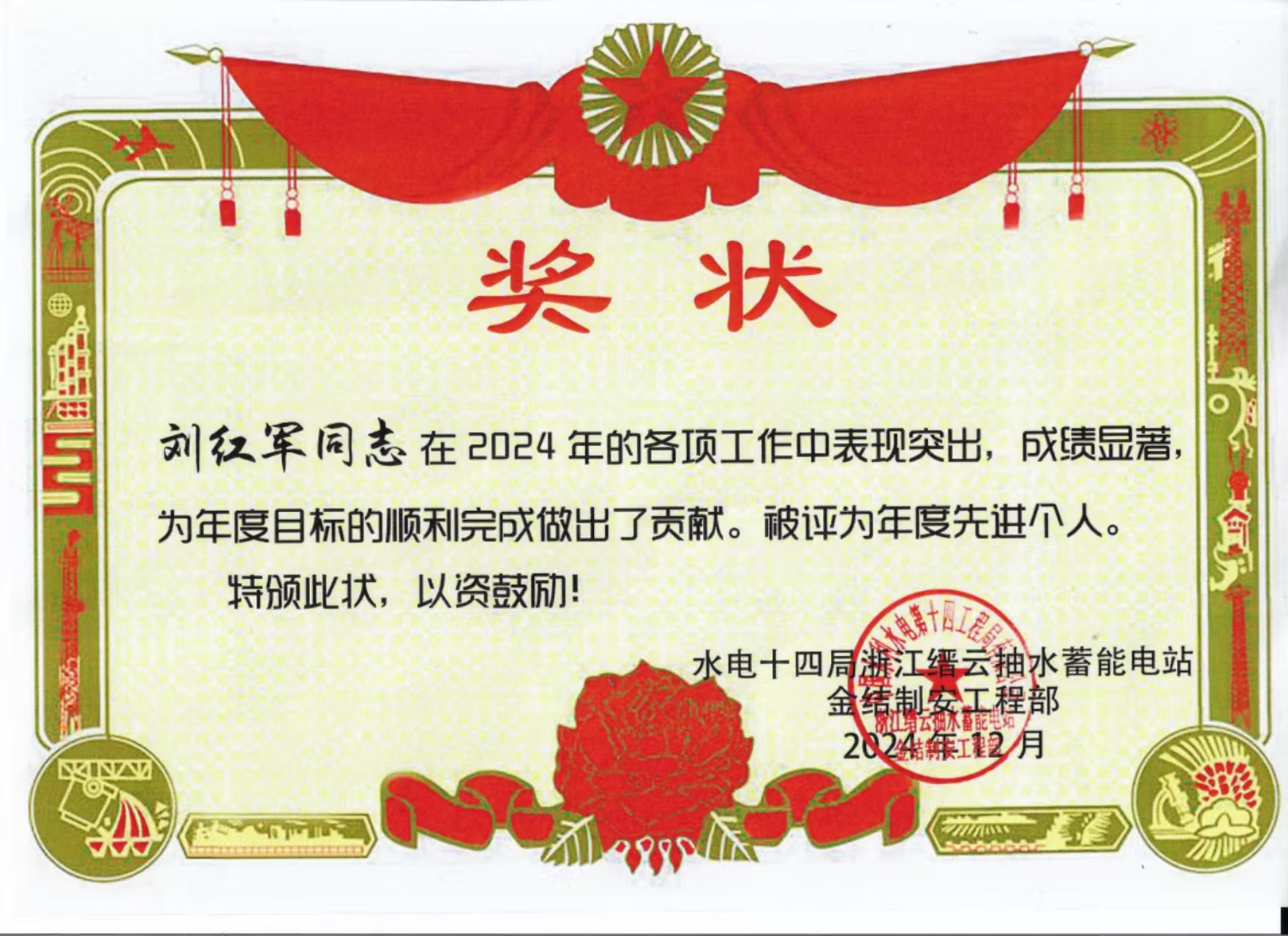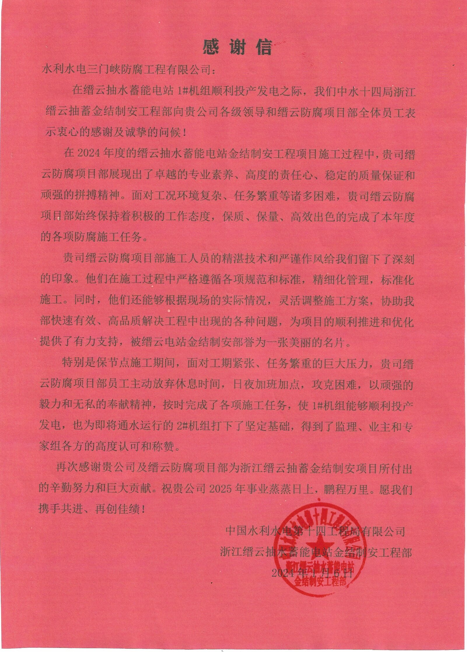 近日,我公司縉云防腐項(xiàng)目部傳來(lái)喜訊,該項(xiàng)目部因在2024年度的浙江縉云抽水蓄能電站金結(jié)制安工程項(xiàng)目施工過(guò)程中的出色表現(xiàn),收到了來(lái)自水電十四局浙江縉云抽水蓄能電站金結(jié)制安工程部的感謝信,同時(shí),項(xiàng)目經(jīng)理劉紅軍同志榮獲甲方授予的年度先進(jìn)個(gè)人稱(chēng)號(hào)。
