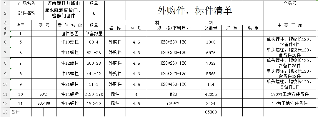 9月11日:九峰山尾水隧洞事故門、檢修門埋件材料采購